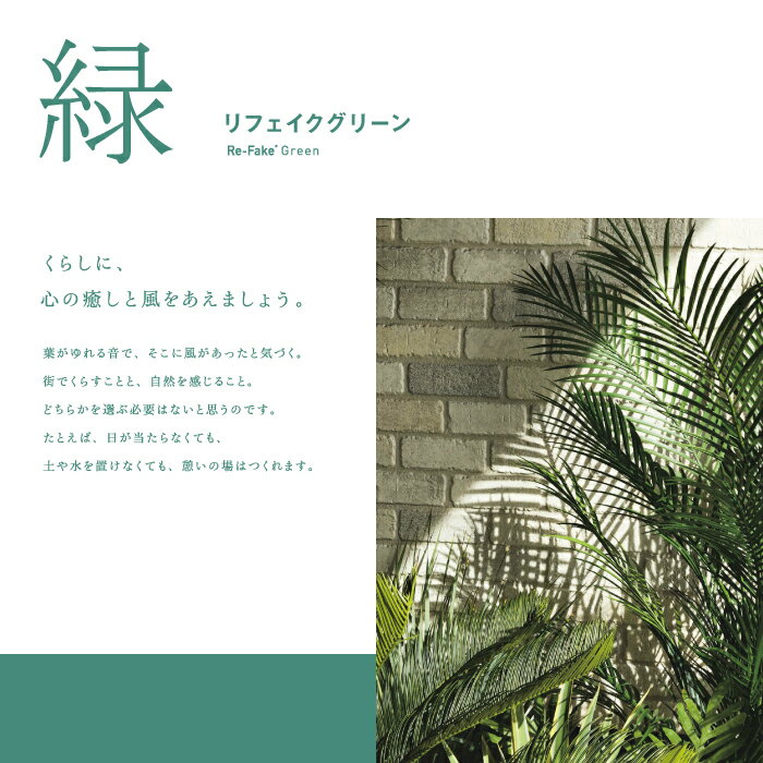 業界初! 屋外で使える 本物の質感を追求したリフェイクグリーンFUV:屋外対応可能+自己消火機能※Re-Fake (リフェイク)とは 「汎用性の高い人工物」という意味のFakeに、「再び」「さらに」「新たに」という意味のReを合わせた造語です。