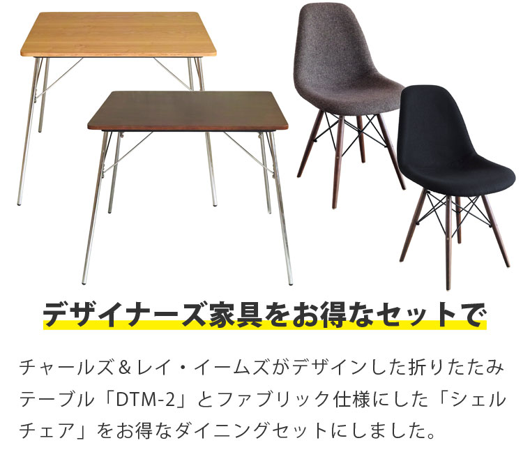 チャールズ&レイ・イームズがデザインした折りたたみテーブル「DTM-2」とファブリック仕様にした「シェルチェア」をお得なダイニングセットにしました。